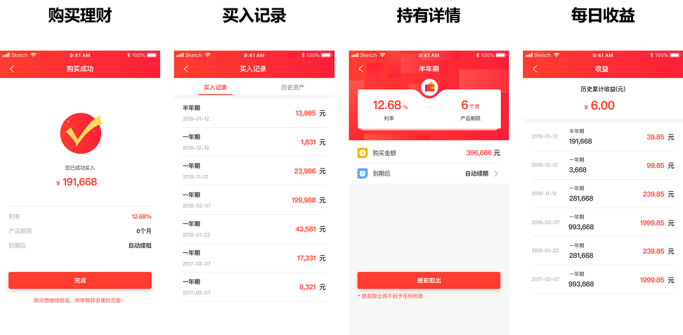 3、理財(cái)詳情頁面(購買理財(cái)、買入記錄、持有詳情、每日收益等情況)