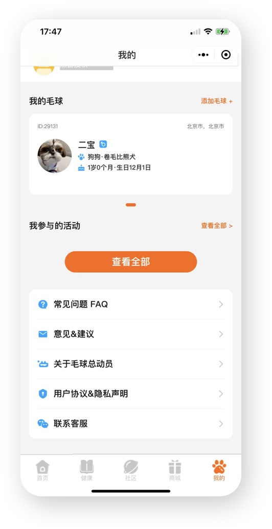 毛球總動(dòng)員社區(qū)我的頁面呈現(xiàn)的主要是寵物個(gè)人信息(類別、年齡、生日等)、我參與的活動(dòng)以及問題、客服、關(guān)于、用戶協(xié)議等常規(guī)模塊。