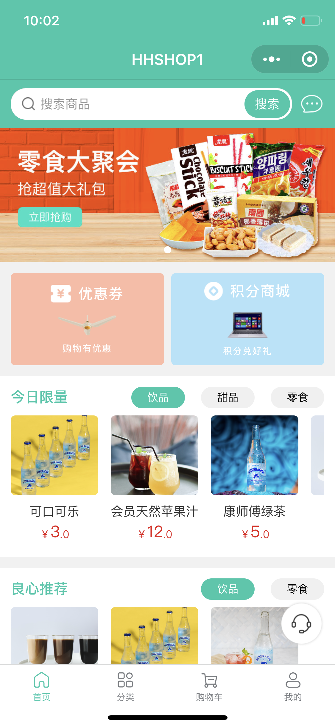 便利店小程序主要包括“首頁、分類、購物車、我的”四個(gè)分區(qū)。在“首頁”板塊,首先有banner展示區(qū),主要播放的是便利店優(yōu)惠活動(dòng)的海報(bào),特色商品、上新商品的宣傳圖等,板塊較大,圖片展示清楚,有利于提高活動(dòng)的曝光率,吸引用戶參與。另外,商家可以通過后臺(tái)更改banner區(qū)的展示圖片,方便用戶及時(shí)了解店鋪的活動(dòng)和其他信息。