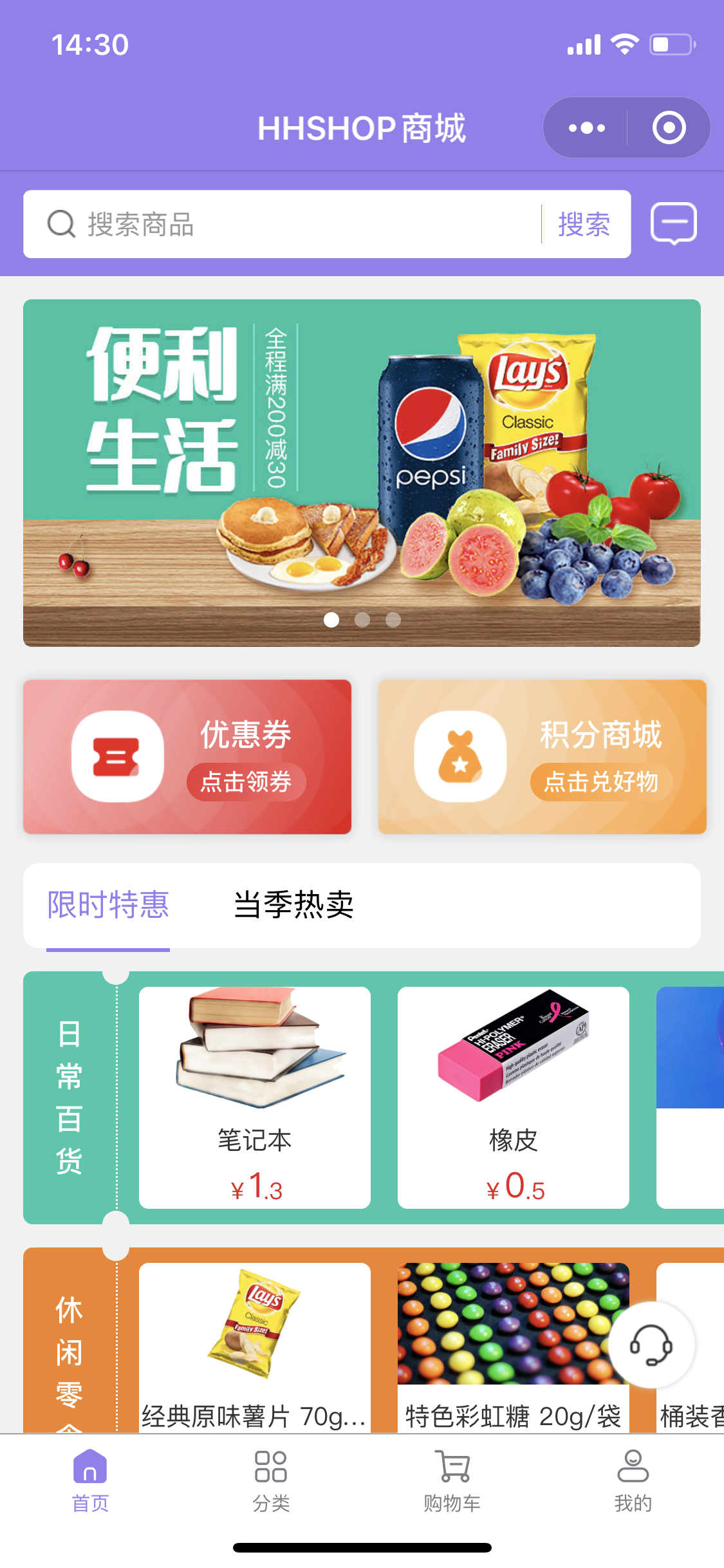 HHSHOP商城目前有符合商超百貨發(fā)展的適用場景,主要包括四個功能分區(qū):首頁、分類、購物車、我的。“首頁”主要是對商超百貨的整體展示,給用戶留以較好的初印象,激發(fā)用戶的深入了解欲望。在最上方,是banner區(qū),主要放置的是店鋪的宣傳圖、促銷優(yōu)惠活動的海報、當(dāng)季熱賣商品的精選圖等,色彩鮮艷明亮,奠定了小程序整體活躍輕松的氛圍,吸引用戶的注意力,有利于促進消費行為的轉(zhuǎn)化。商家可以隨時在后臺對banner圖進行實時的替換更新,以便給用戶提供最新最及時的訊息通知。