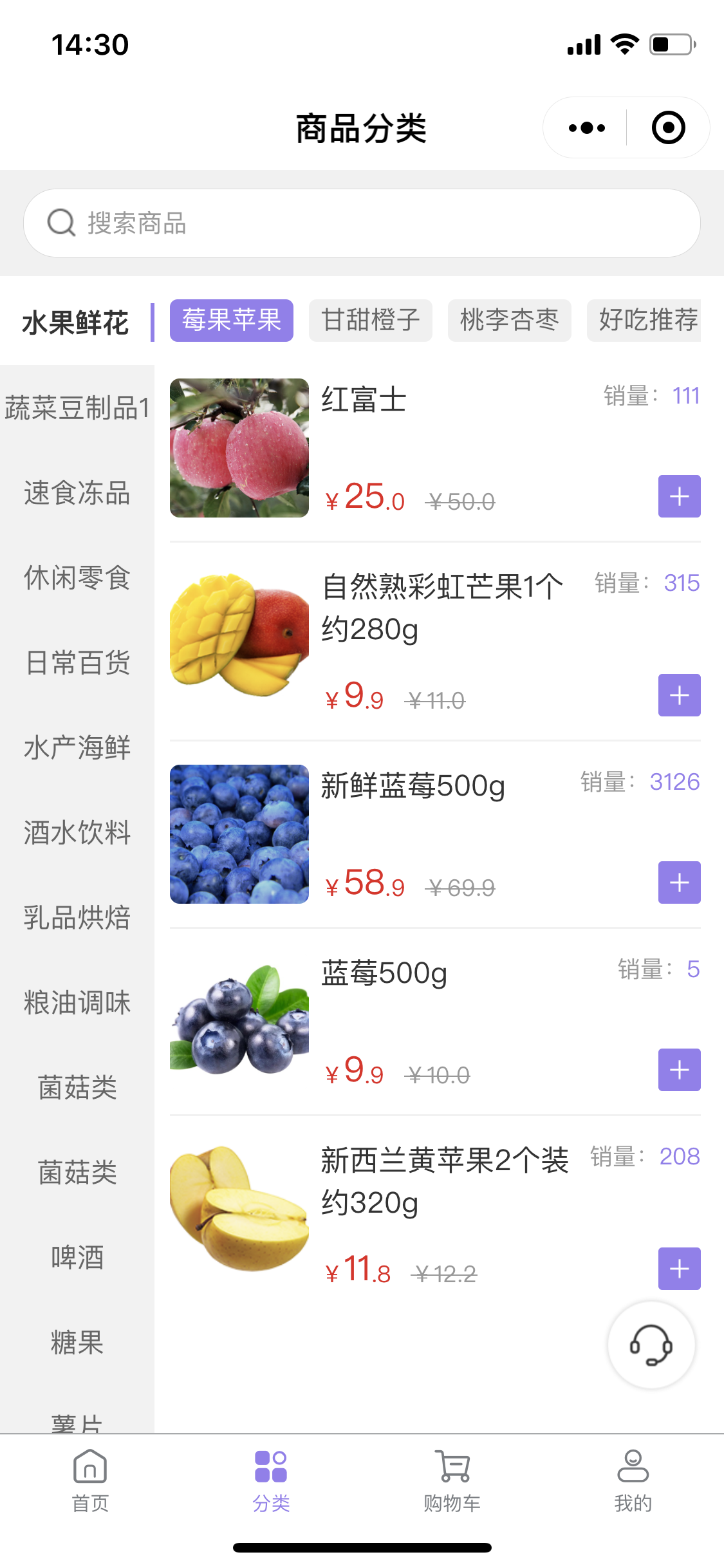 在“分類”板塊,由于商超百貨的商品種類繁多,因此商品的分類更加細致,包括“蔬菜鮮果、速食凍品、休閑零食、水產(chǎn)海鮮、酒水飲料、乳品烘培、糧油調(diào)味”等多個分欄,用戶可以根據(jù)自己的需求自行瀏覽,也可直接在搜索欄搜索關(guān)鍵詞精準查找。在選定商品后,用戶即可下單購買,生成訂單信息。“購物車”板塊主要是用戶加入購物車的商品信息,用戶可以將心儀商品加入到購物車中在商品失效前隨時購買。