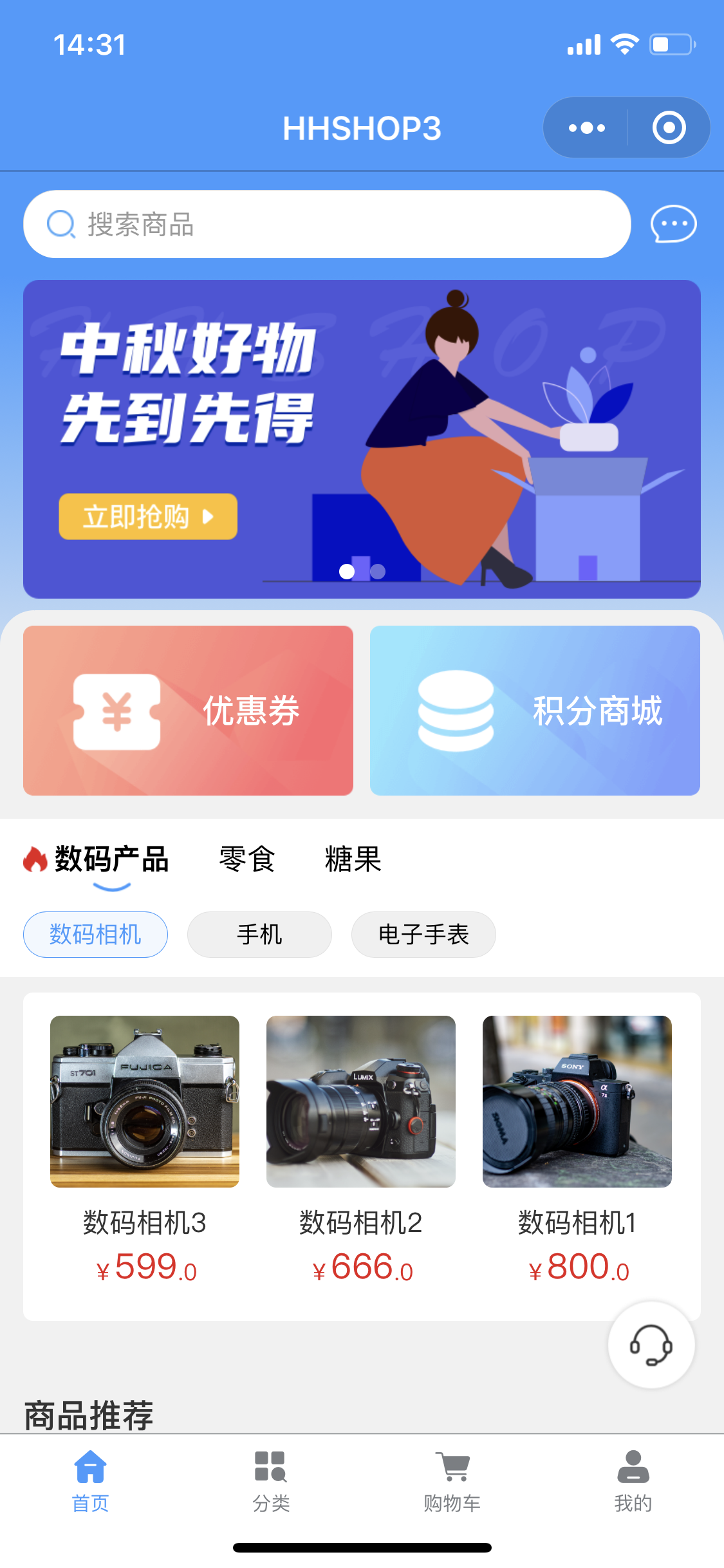 綜合電商小程序主要有“首頁(yè)、分類、購(gòu)物車、我的”四個(gè)功能分區(qū)。在“首頁(yè)”板塊,首先是banner區(qū),主要展示的是不同主題、類別的活動(dòng)宣傳圖,例如中秋假日的優(yōu)惠活動(dòng)或數(shù)碼產(chǎn)品的促銷活動(dòng)。還包括許多其他類別的上新商品的精選圖等等。板塊較大的banner區(qū)通過(guò)精美的圖片展示和優(yōu)惠較大的活動(dòng)推廣可以首先幫助用戶了解平臺(tái)內(nèi)的活動(dòng)和商品信息,吸引用戶的注意力,提高用戶的留存率,激發(fā)用戶的購(gòu)買欲望。