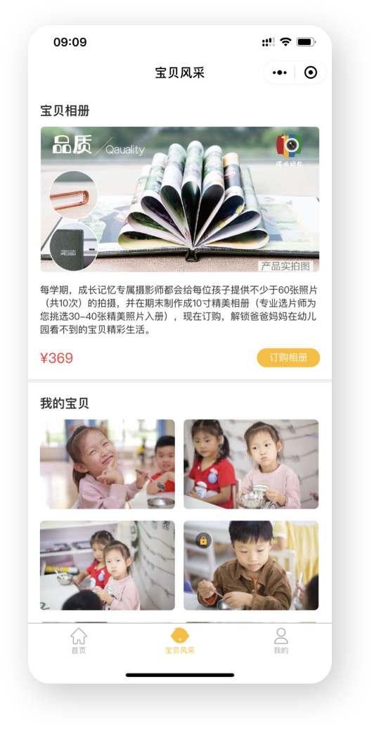 3、家長(zhǎng)可以進(jìn)行相冊(cè)的購(gòu)買(mǎi),成長(zhǎng)記憶提供照片精修入冊(cè):