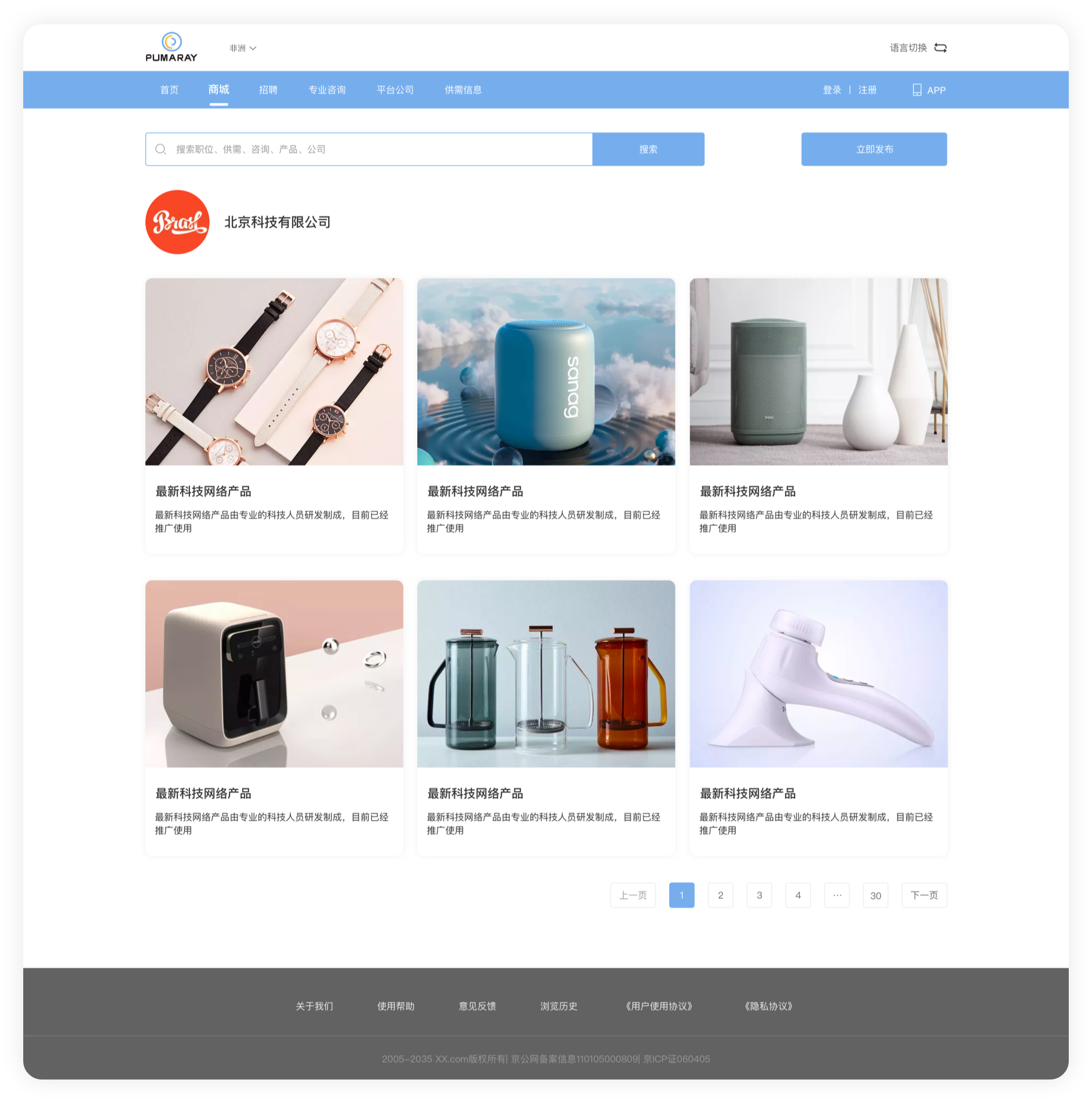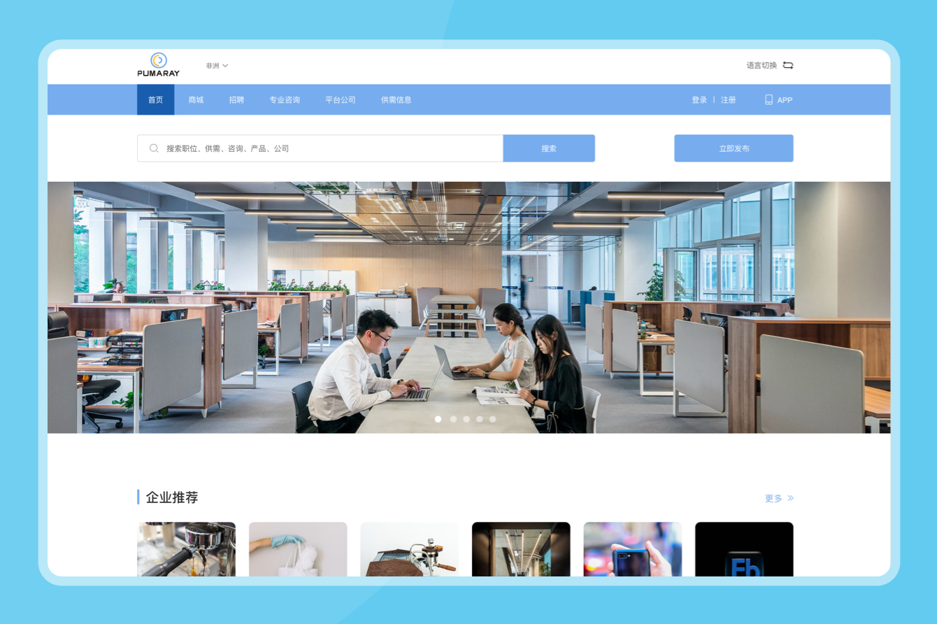 標瑪光圈(PUMARAY),是一款針對非洲那邊用工的招聘平臺。針對的痛點就是客戶在非洲招聘華人成本比較高,做個招聘平臺,企業(yè)可以發(fā)布招聘需求, 還有供需求信息在平臺發(fā)布,幫助華人和招聘需求方建立溝通橋梁,方便信息通暢。