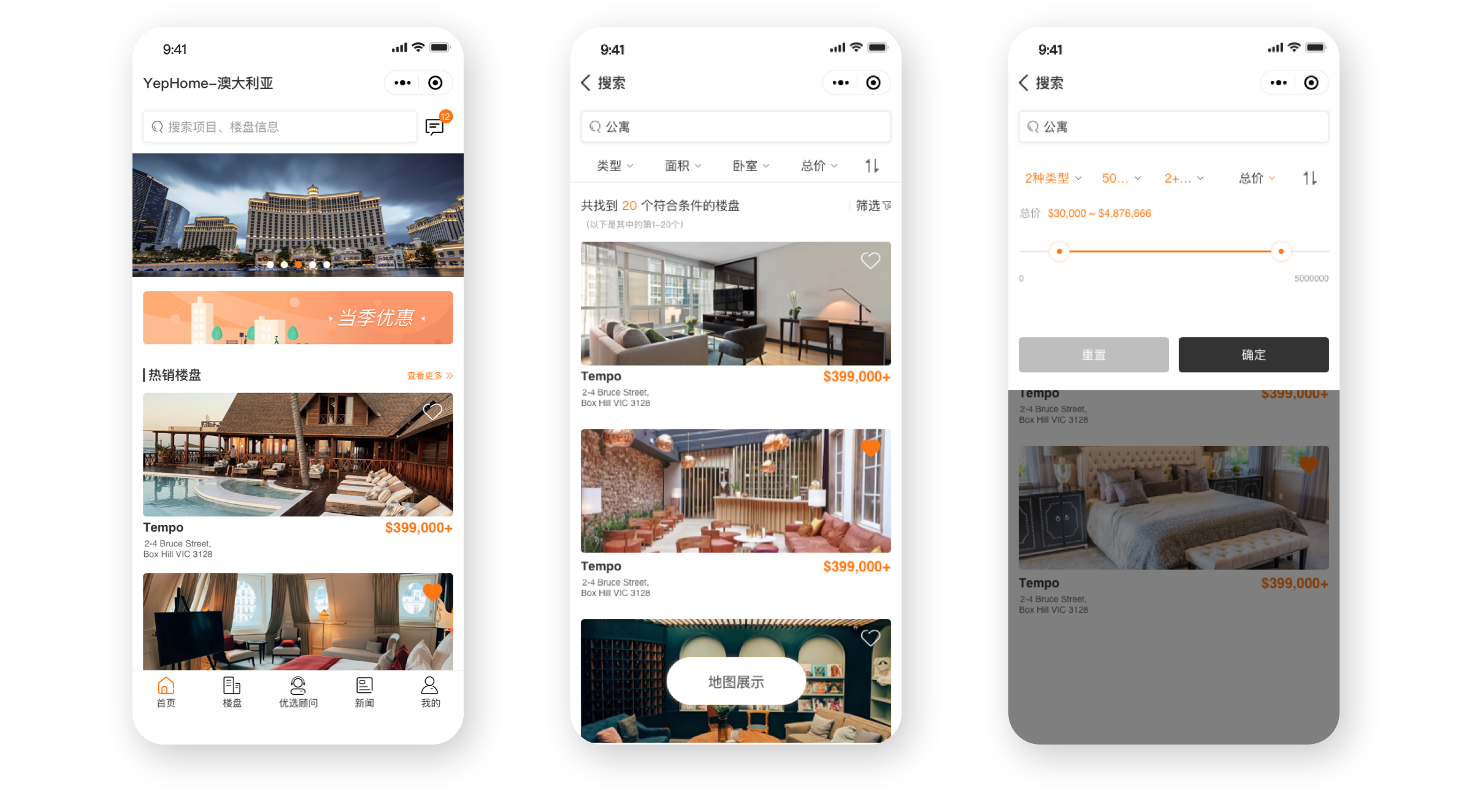 YepHome小程序,是北京合合科技承接的房屋中介線上平臺小程序,包括樓盤地理位置顯示、樓盤列表,線上云展廳推薦、與售樓顧問在線溝通、新聞資訊等等。