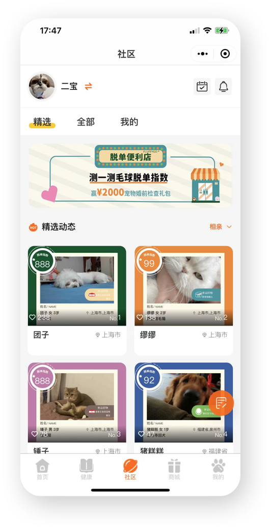毛球總動(dòng)員社區(qū)頁面呈現(xiàn)的主要是寵物相親模塊、寵物動(dòng)態(tài)模塊。
