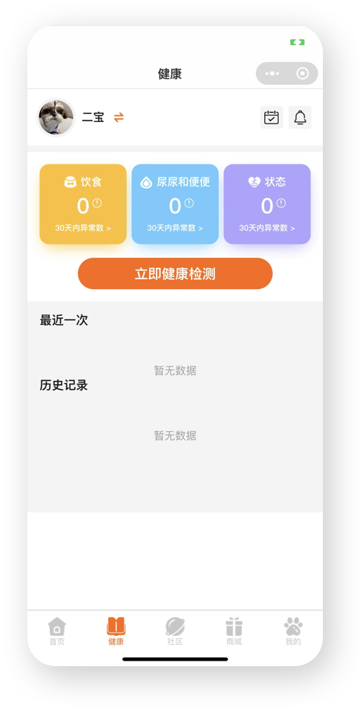 毛球總動(dòng)員健康頁面呈現(xiàn)的有飲食模塊、尿尿便便模塊、狀態(tài)模塊、以及健康檢測歷史記錄。