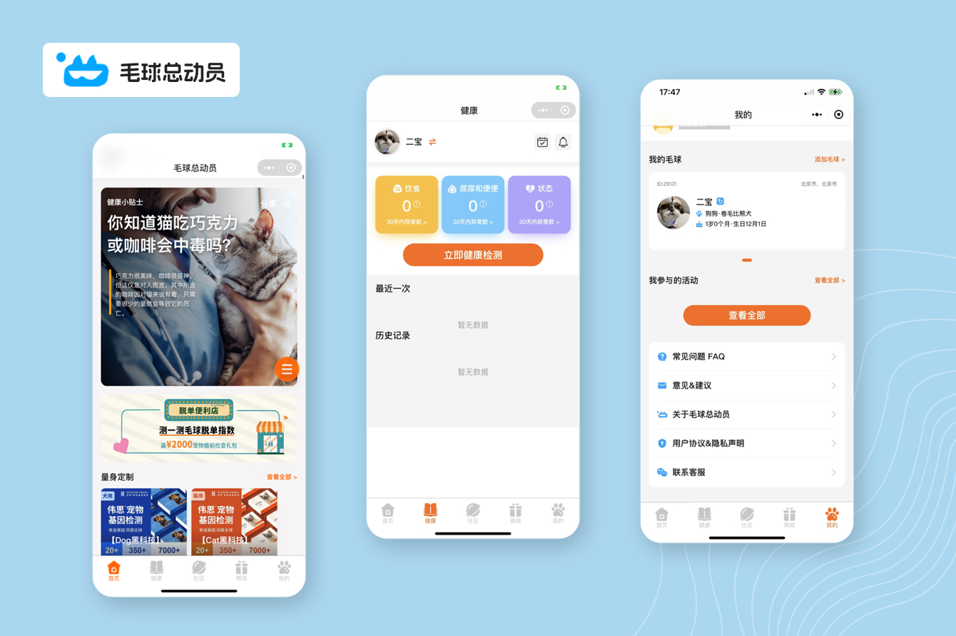 毛球總動(dòng)員首頁呈現(xiàn)的有輪播圖、脫單便利店、量身定制的寵物基因檢測、寵物護(hù)理專業(yè)課程、寵物相關(guān)的熱門活動(dòng)等。