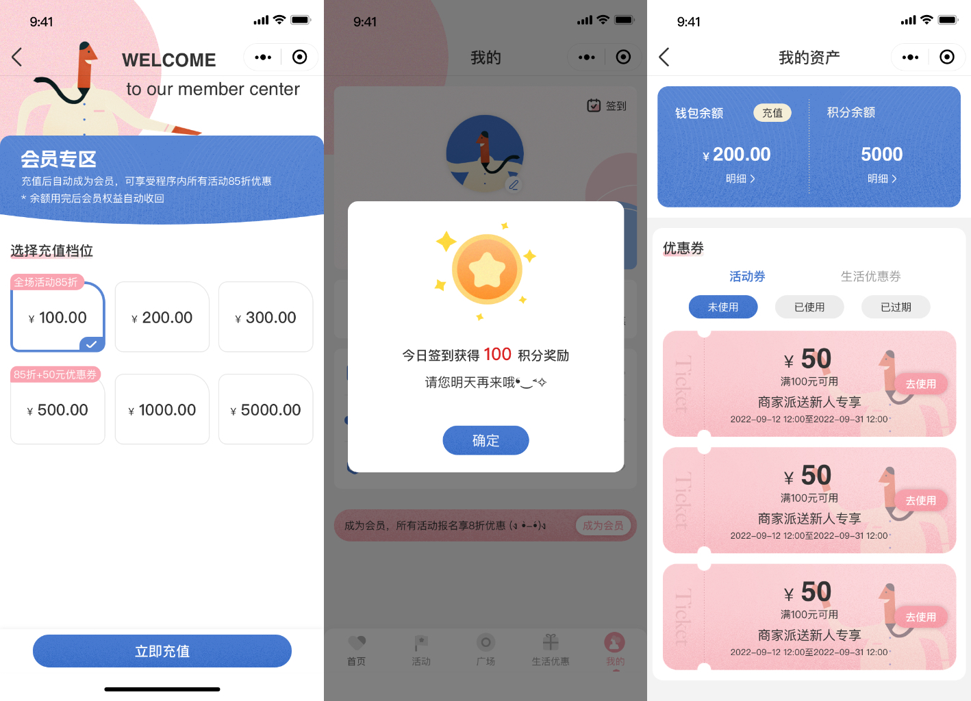 會員服務(wù),簽到積分,錢包等。用戶充值后自動成為會員,可享受程序內(nèi)所有活動8.5折優(yōu)惠,余額用完會員權(quán)益收回,簽到積分可兌換現(xiàn)金折扣使用,錢包中可以查看余額。