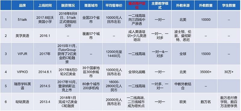像VIPkid、VIPJR、瑞思、噠噠等英語(yǔ)機(jī)構(gòu)發(fā)展迅速,線下的一些英語(yǔ)培訓(xùn)機(jī)構(gòu)也開(kāi)始開(kāi)發(fā)相關(guān)APP,來(lái)促進(jìn)教學(xué),提升教學(xué)效果。我對(duì)一些英語(yǔ)教育機(jī)構(gòu)進(jìn)行了總結(jié)分析,如下表: