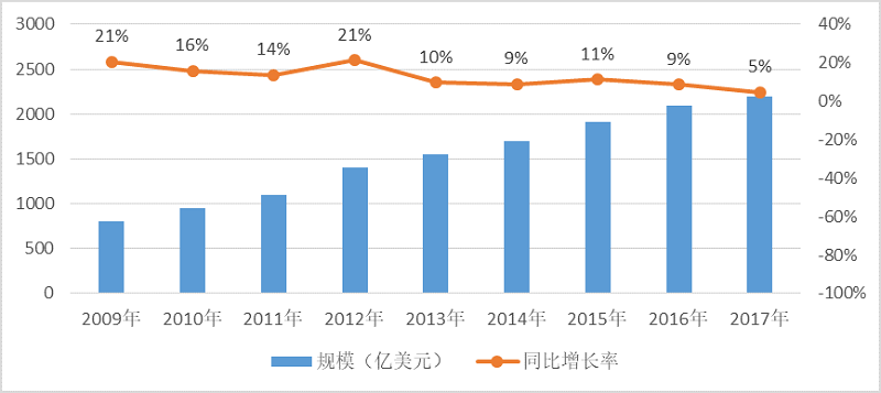 在全球信息化浪潮的強(qiáng)烈推動(dòng)下,軟件產(chǎn)業(yè)在全球范圍內(nèi)已經(jīng)發(fā)展成為一個(gè)規(guī)模龐大、最具活力的產(chǎn)業(yè)。2009年,全球軟件外包規(guī)模在800億美元,到2017年,全球軟件外包規(guī)模達(dá)到2200億美元。全球軟件外包行業(yè)經(jīng)過(guò)快速增長(zhǎng)狀態(tài)后,目前增長(zhǎng)率趨緩,增長(zhǎng)率仍然在接近10%左右。